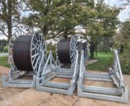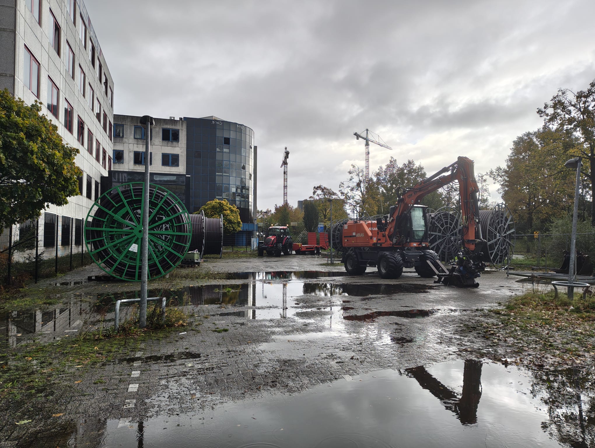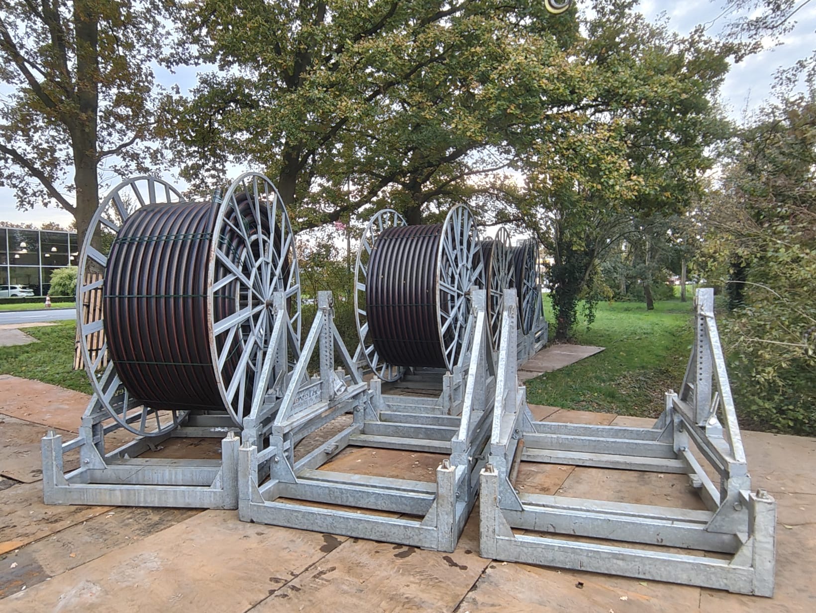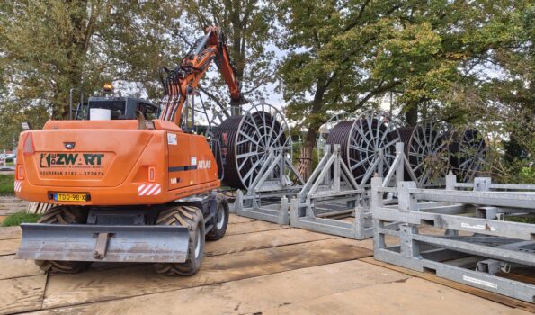Tijdens deze werkzaamheden zorgt onze collega Raymond er met de kraan voor dat de haspels en mantelbuizen veilig en nauwkeurig in de bokken worden gehangen, zodat het project efficiënt en volgens planning kan verlopen.